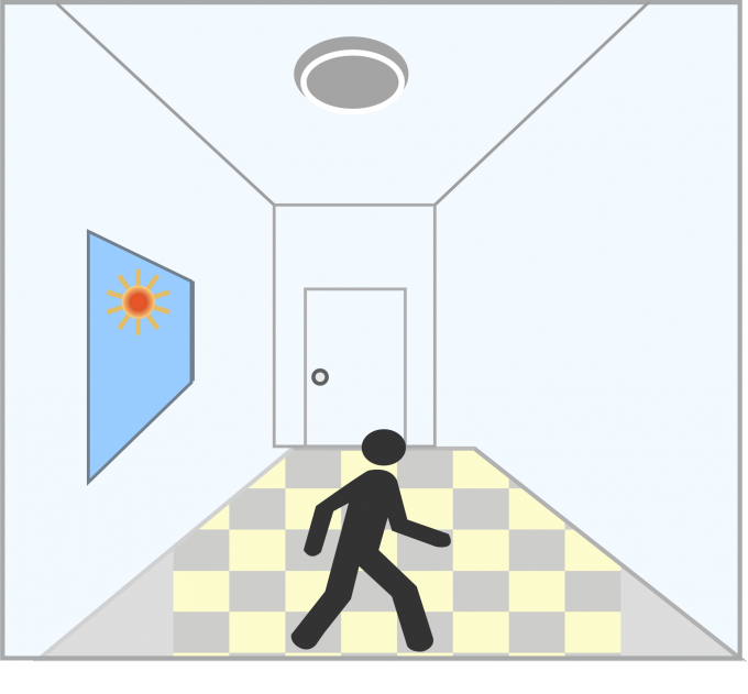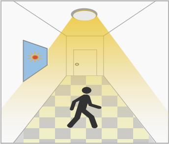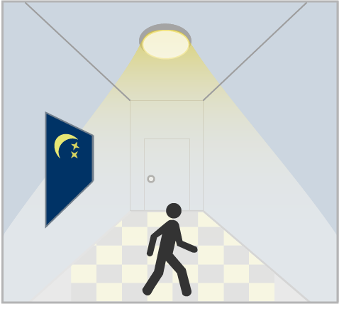 Svjetlo se pali kada se detektira kretanje i isključuje se nakon što ljudi odu noću. Primjene: Hodnik, Stubište. Prag dnevnog svjetla postavljen je na "2Lux, 10Lux, 50Lux".