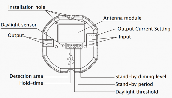 5. Tvorničke postavke: područje detekcije 100%/vrijeme zadržavanja 5s/onemogućavanje praga dnevnog svjetla/razdoblje mirovanja 0s/razina zatamnjenja u stanju pripravnosti 10%.